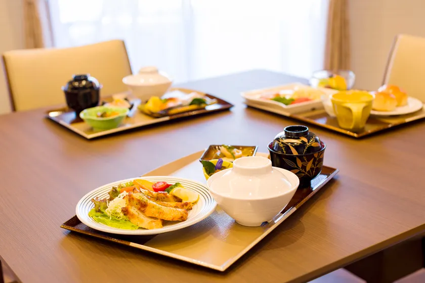 楽しみのひとつでもある食事は、栄養士が監修しシェフが心を込めて作る、栄養たっぷりでき立ての美味しい食事をご用意しております。朝食は和洋の2種類から、昼食はメインのお料理を、肉・魚・その他のメニューから選べるレストラン方式を採用しています。夕食は、統一食をご用意しており、ご入居者様の咀嚼の状況に合わせて、刻み食やペースト食にも対応しています。また、四季折々の行事に合わせ、旬の食材を使った特別な日の料理なども提供してまいります。