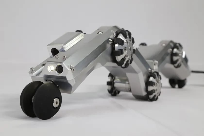 リンクをジグザグに配置し、車輪を配管内壁に押し付けることで、水平だけでなく垂直の配管内も走行可能な自走式ロボットです。