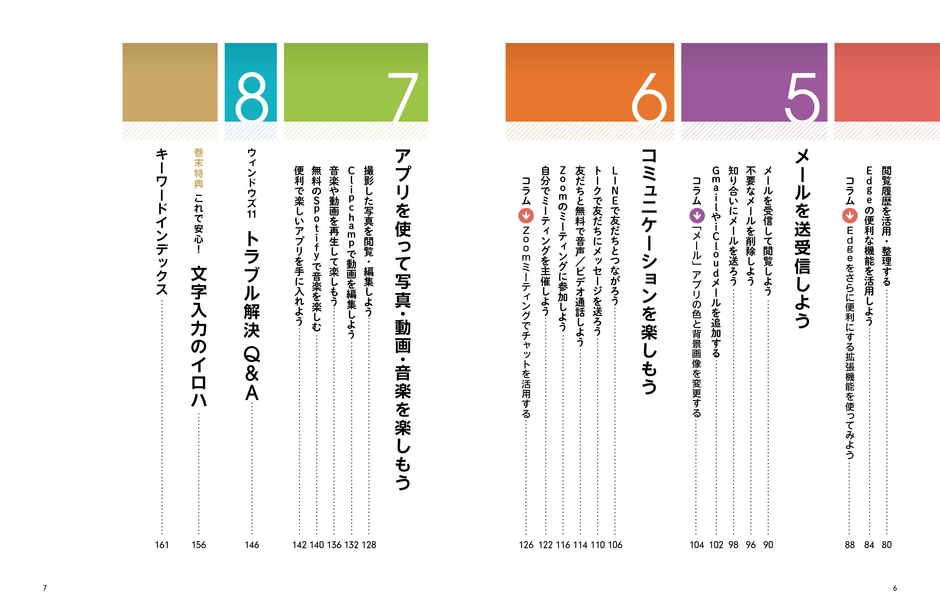 また、インターネット閲覧に用いる「Edge」や標準搭載の「メール」の使い方もそれぞれの章を設けてわかりやすく説明しているほか、トラブル発生時の対処法をまとめたQ&Aパートなども収録しています。