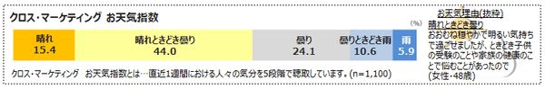 クロス・マーケティングお天気指数とは、直近1週間における人々の気分をお天気で表したものです。お天気の理由も一部抜粋してお知らせします。