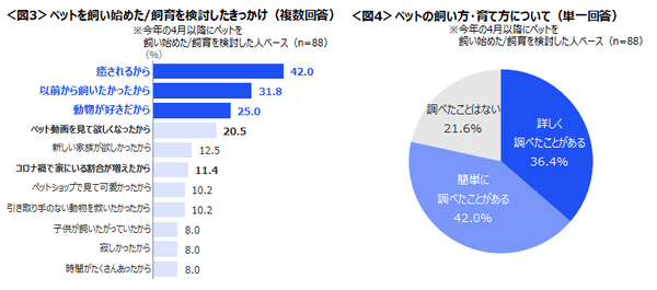 また、『ペット動画を見て欲しくなった』が21%、『コロナ禍で家にいる割合が増えた』が11%など、おうち時間が増えたことによる影響も窺える。<図3>