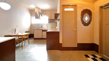 「Vintage House アメリカンミッドセンチュリーに暮らす」は、戸建ての和室をアメリカ映画に登場するようなLDKにリノベーション。ワンルームですが、異なる床材やデザインウォールを使い、LDK・廊下・キッチンがそれぞれ独立しているように見せる工夫を凝らしました。一般的な「家」の概念を取り払った自由な空間です。