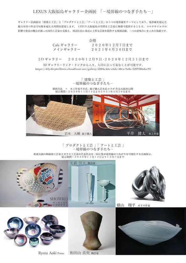 大阪トヨタ自動車株式会社(代表取締役社長:小西 俊一)は、西日本最大のLEXUS店舗 LEXUS大阪福島と併設のL SIDE CAFEにて開催した、日本の工芸家の活躍を支援するギャラリー企画展「―境界線のつなぎ手たち―」の会期を好評につき2020年12月7日まで延長します。また、新型コロナウイルスの感染拡大につき来場が叶わないなどのお客様のお声に対応し、会場に来場できない方に向けた3Dギャラリーも同時にオープン致します。