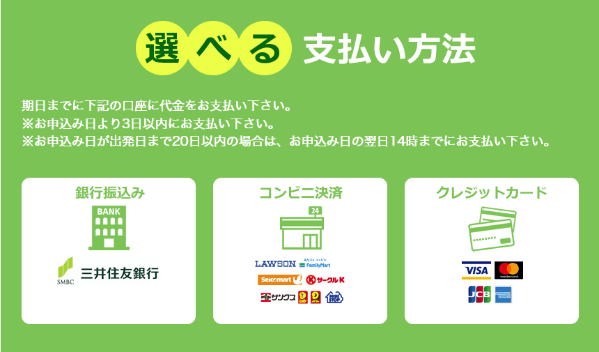 ●カード決済・コンビニ決済・銀行振込から選べるお支払い方法