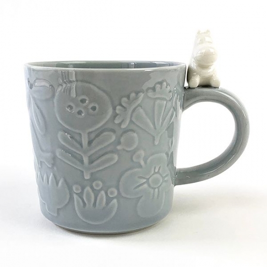 グレーのシックなカラーに、お花のモチーフのマグカップ。しかもムーミンのフィギュア付きなんです。