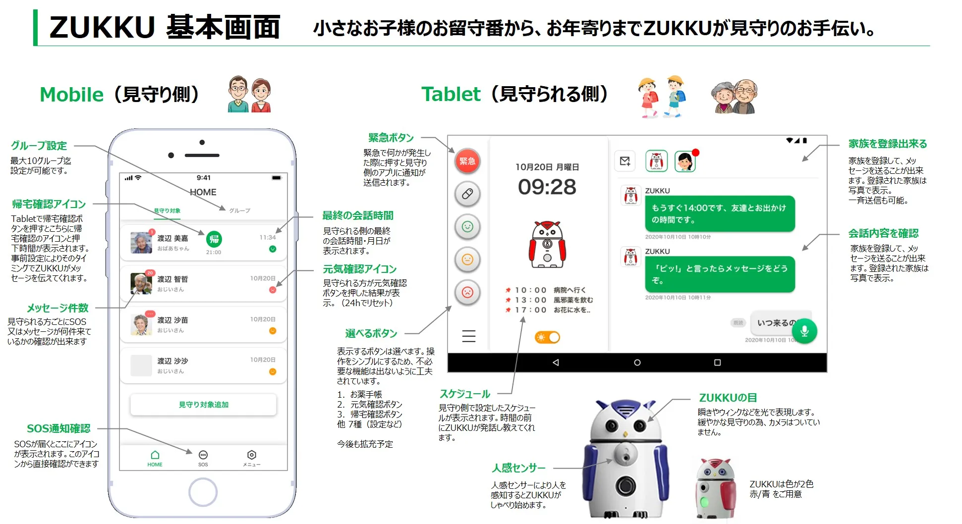 ■ 今回のリニューアルでは「ケジュール・お知らせ機能」を追加し、ZUKKUが家族に代わってメッセージやスケジュールを音声でお知らせします。