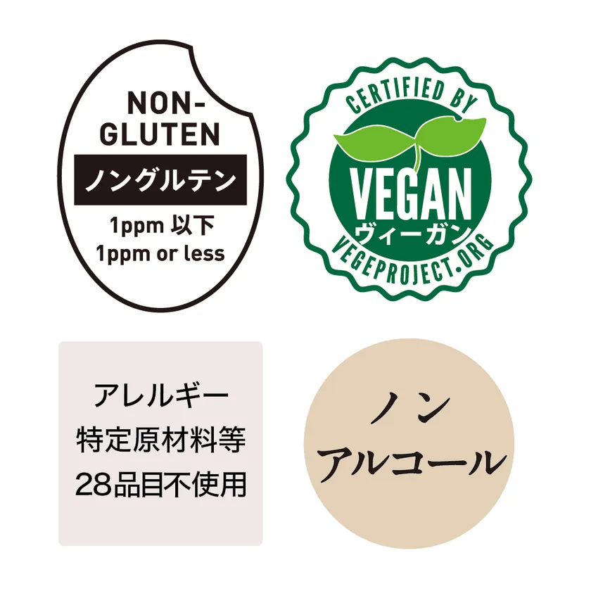 ノンアルコール・ノングルテン(※1)・ヴィーガン認証取得・アレルゲン28品目不使用で、お子さまや妊娠中の方はもちろん、アレルギーをお持ちの方や健康意識の高い方にも安心してお召し上がりいただけます。