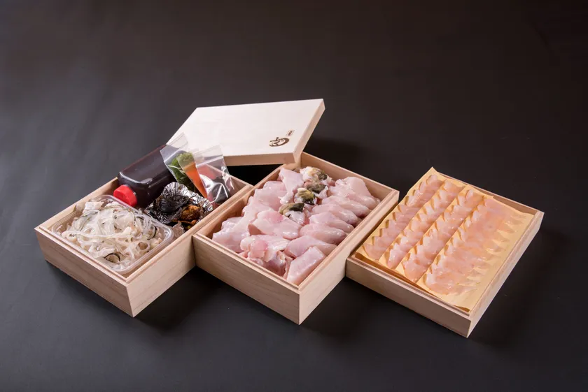 【セット内容】 活けふぐ桐三段重箱セット4人前