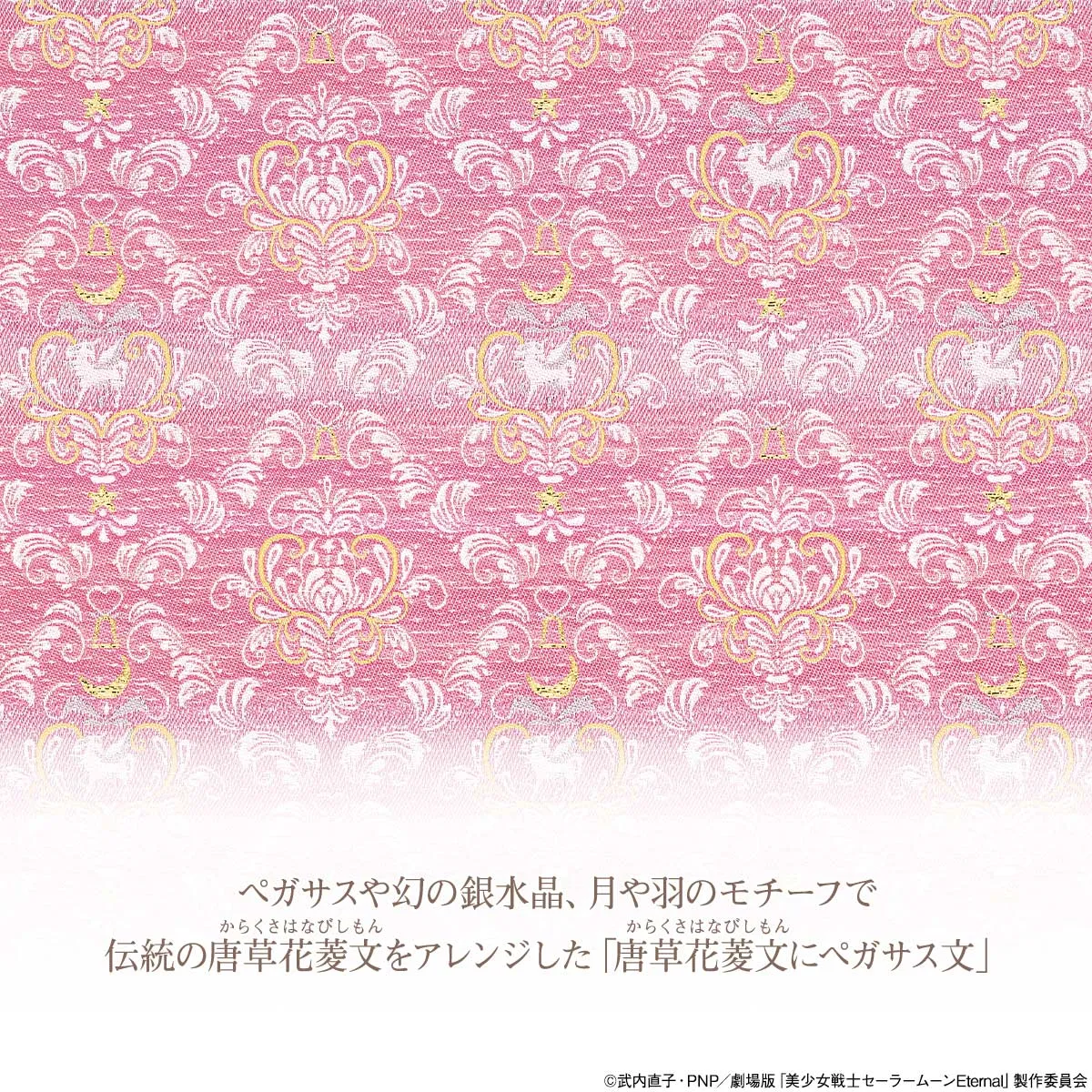 コズミックブルーのグラデーションに金糸があでやかに浮かび上がる、スーパーセーラームーンの「月に流麗唐草文」に、ライトピンクのグラデーションが甘いときめきをかきたてる、スーパーセーラーちびムーンの「花菱唐草文にペガサス」。