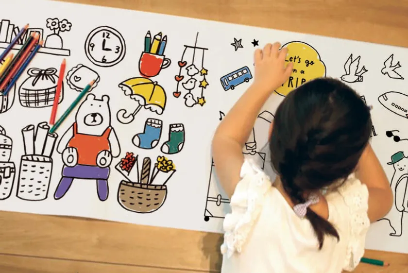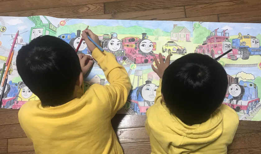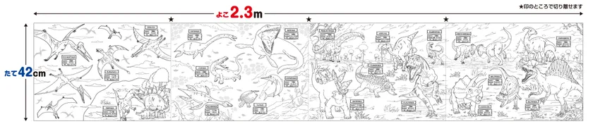 家族やお友達と一緒にぬるのに便利な超ビッグサイズ!ぬりえシートのサイズは、横2.3m×縦42cm。切り取り線に沿って4枚に切り分けて使うこともできます。使用しないぬりえシートは、クルクル巻いてパッケージ箱に収納して保管するこができます。