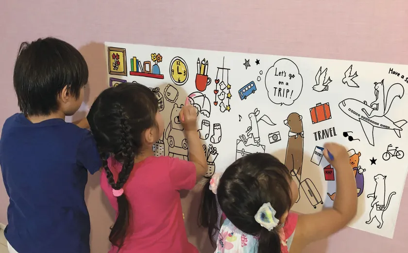 ぬりえシートの裏全面は、貼ってはがせる糊残りしにくい弱粘着のシールタイプ。ぬりえシートを机や床に貼り付けてぬることで、手で押さえながら色をぬるのが難しい小さなお子様にもぬりやすい仕様です。ぬり終わったぬりえシートは、壁に貼って飾ることもできます。弱粘着のため、一時的な装飾にも最適です。