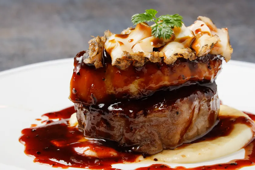 俺のフレンチの一番人気メニュー「牛フィレとフォアグラのロッシーニ」に鮑を乗せ、ソースには岩手県産アワビ醤油吟醸調味料を使って仕上げた贅沢な一皿です。
