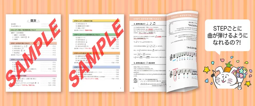 1STEPごとに1曲ずつチャレンジしていく設計になっているため、基礎が自然に身につくのも特徴の1つです。STEP1の「かえるの合唱」からSTEP16のジャズ曲「オール・ザ・シングス・ユー・アー」まで1STEPごとにチャレンジ曲として導いていきます。「うっきうきシート」という習得できた日付を書き込む付録もついており、楽しく自力でピアノを続ける習慣が自然と身につく設計です。