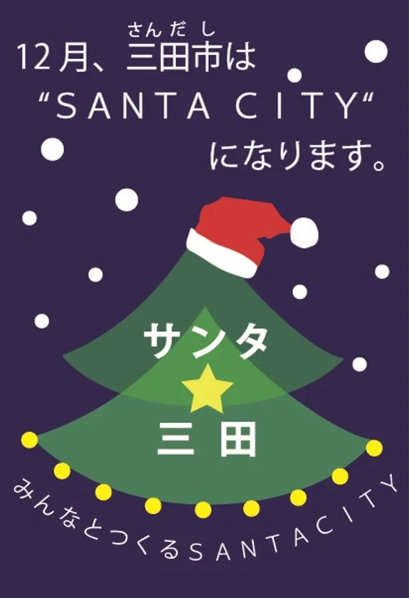 三田市では12月を「サンタ月間」と位置づけ、「みんなとつくるSANTA CITY」を合言葉に、市民・団体・事業者・学生・報道機関の皆様と連携し、市全体として盛り上げていきます。