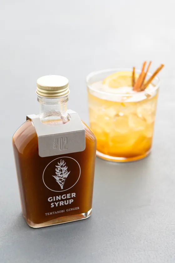高知県産の生姜、三重県熊野古道で育ったマイヤーレモンを使い、愛知県豊橋市で小規模生産された、辛味、香味、色味が整ったジンジャーシロップを使用しています。シロップは物販でも販売します。スパイスのバランスが良く、ソーダで割るのはもちろん、和食料理で砂糖の変わりに使うのもおすすめです。