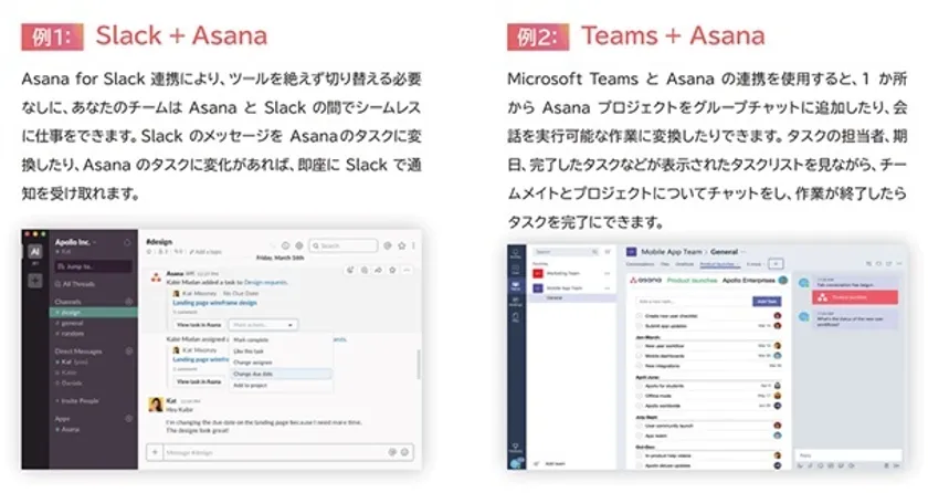 普段使いのメール、クラウドストレージ、チャット、チケットなどをAsanaに取り込み、すべてを1カ所にまとめることができます。各ツールを横断した作業がなくなるため、作業効率を最大限高めることが可能になります。