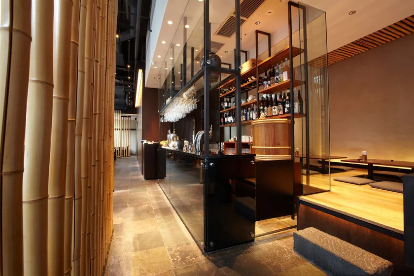 こだわりの旨い蕎麦、備長炭で焼く炭火串焼きと酒肴、厳選したワイン、全国各地の焼酎・清酒が満喫できる赤坂見附・永田町の蕎麦居酒屋。解放感溢れるガーデンテラスに面した店内は、竹林をイメージしたこだわりの空間。