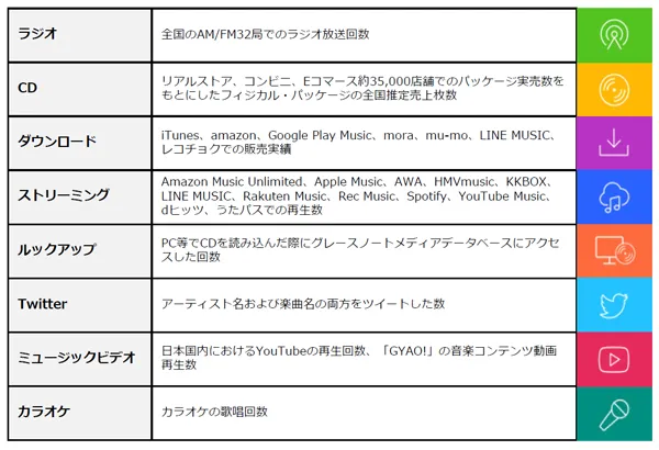 全国推定売上枚数、ダウンロード回数、ラジオ放送回数、ルックアップ数、ツイート数、ストリーミング数、YouTubeおよびGYAO!の動画再生回数、カラオケ歌唱回数を元にした独自ポイントを合算した米国でもBillboard音楽チャートの中心となるチャート