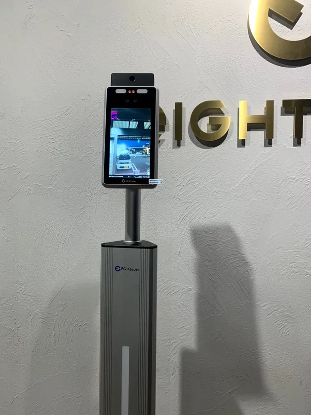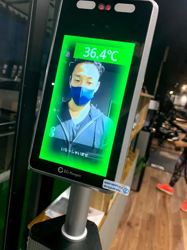 これまで入館時に、スタッフもしくは会員が検温を行い、紙に名前と体温を記入するようにしていましたが、新たにエントランスに非接触型の自動検温システムを設置しました。サーモカメラ・サーモグラフ・赤外線センサー・AIカメラのついた高性能の機器のため、スタッフが会員に近づいて検温する必要がなくなり、スタッフ不在時も確実に、素早く検温できると、会員にも好評です。また、マスク未着用の場合は着用を促すアナウンスが流れ、検温データと入館者の写真を記録します。さらに、体温が37.4以下の場合には検温器から「カッコウ」の鳴き声が出るため、館内の会員にも聴覚で知らせることができます。スタッフ不在時の深夜~朝にかけての来館者も含め、検温システムを通過した人だけが確実に来館できる状況を作ることにより、トラブル防止や会員の安心感につながると考えています。