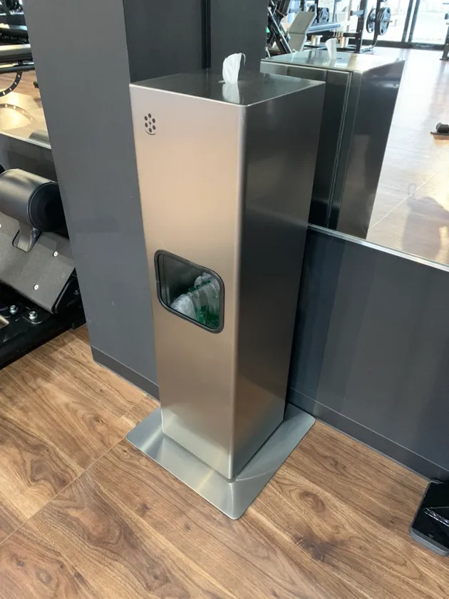 トレーニング後、各マシーンのふき取りは、これまで、ペーパータオルと除菌スプレーを準備していましたが、先月から、エタノール入りの除菌シートを設置しました。