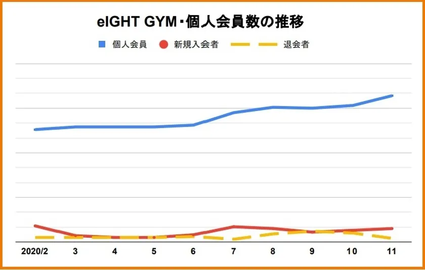 新規入会者数と退会者数が逆転した9月は、1人減少、となりますが、その後の10月、11月は体験者も多く、また新規入会が10人以上の月が続き、当ジムへの期待を感じました。