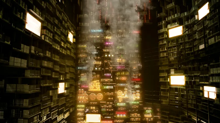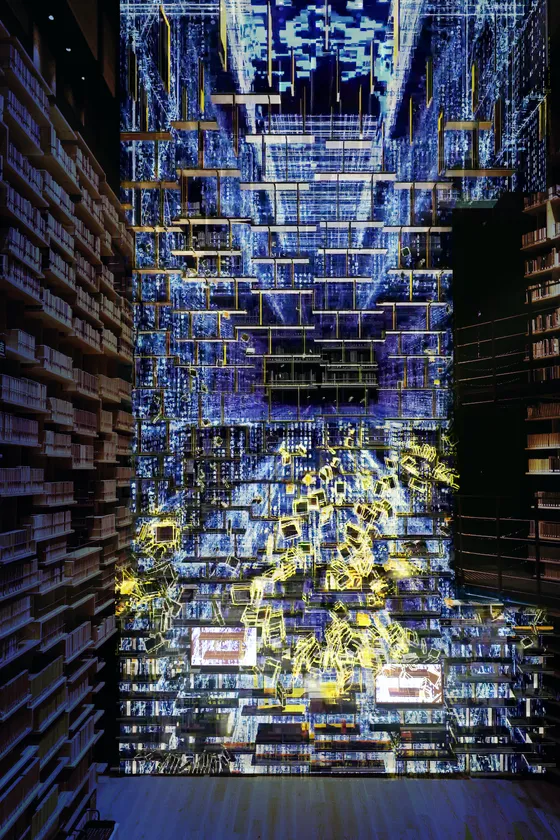 世界的建築家である隈研吾氏がデザイン設計を手掛け、「角川武蔵野ミュージアム」の館長である松岡正剛氏の監修によって生まれたこの空間は、本棚が違い棚のように互い違いとなって複雑に入り組み、立体的、流動的に連なって、脳の構造をイメージした造りになっています。今回のプロジェクトは、他に類のないこのような空間へのプロジェクションマッピングの制作となりました。