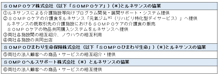 SOMPOホールディングスとルネサンスは、2020年7月の資本提携を機に健康寿命延伸を目指し協働して取り組むパートナーとして業務提携に向けた検討体制を立ち上げ、具体的な協業内容等について協議してまいりました。