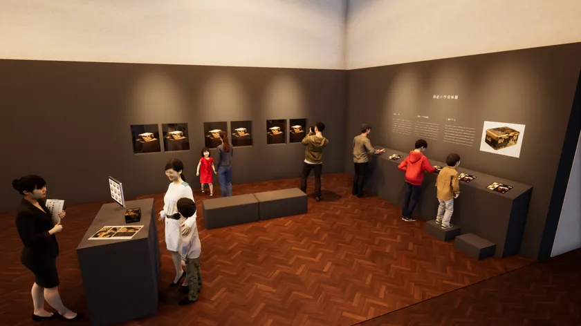 「ウルシノキ」の樹液を、器の表面に塗り重ね飾ったものを漆工芸とよびます。この樹液に色をつけたり、漆を接着剤のように使い金属の粉を蒔きつけたり(蒔絵 まきえ)、金属や貝殻の薄い板を貼りつけたり(螺鈿 らでん)と、さまざまなテクニックで文様を表します。会場のタッチ端末では、漆工芸に用いられるテクニックを学びながら、尾形光琳の代表作である国宝「八橋蒔絵螺鈿硯箱」を題材としたオリジナルの漆の箱をデザインできます。(コンテンツ制作:TNYU Inc.)