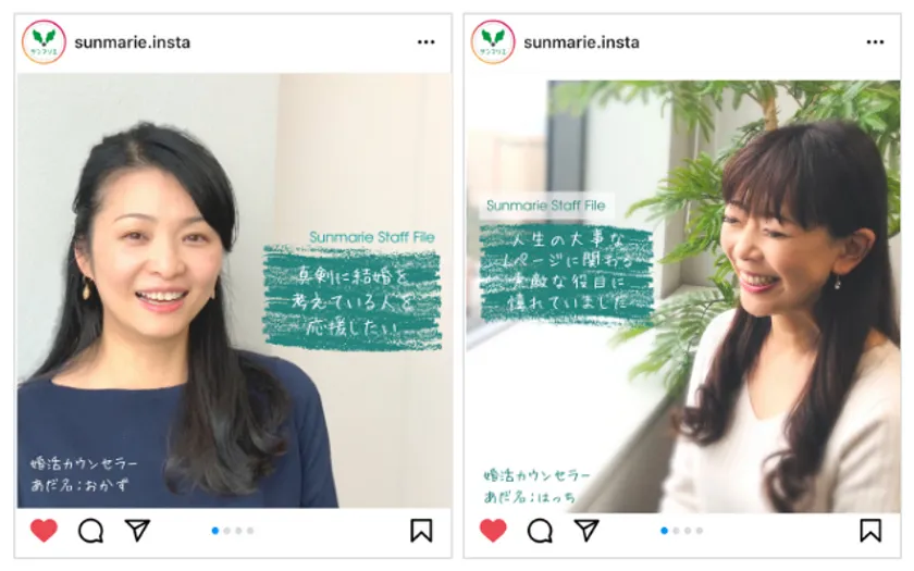 リニューアルしたサンマリエ公式Instagramでは、『婚活をサポートしてくれるカウンセラーはどんな人だろう…』というお客様の声にお応えして、実際に活動をサポートするカウンセラーをはじめ、サンマリエのスタッフ紹介も新たに配信を開始しました。