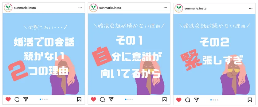 その他にも、リニューアルしたサンマリエ公式Instagramでは、サンマリエに親しみを覚えて頂けるような「スタッフの日常」や、「婚活のお悩みに応えるプチアドバイス」など、最新お役立ち婚活情報を中心に盛りだくさんで配信してまいります。