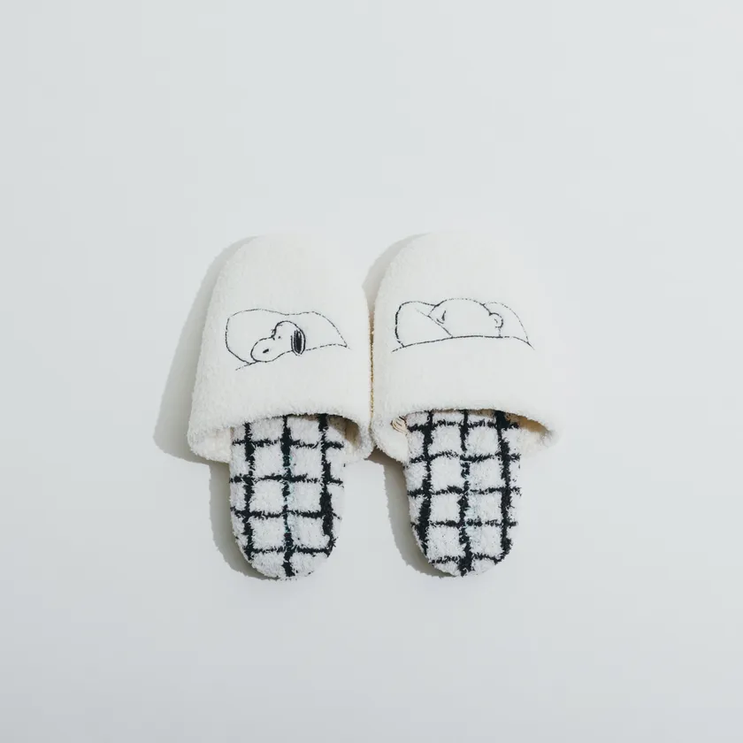 ずっと触っていたくなるような柔らかくてふわふわな生地に、スヌーピーとチャーリー・ブラウンのおやすみシーンをデザインしたルームシューズです。