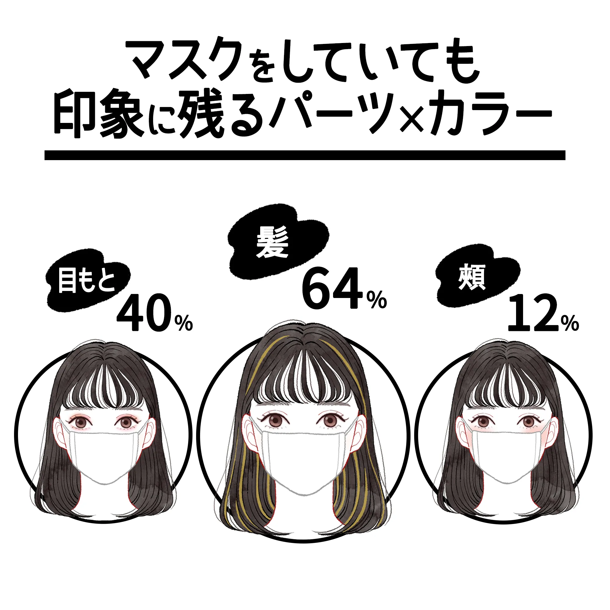 さらに、“半顔”の3つのパーツにカラーアイテムを使用したイラストで「印象に残るパーツ」を調査したところ、「髪」がトップ(64%)で、他を大きく上回っています。