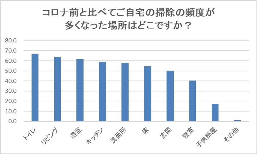 なかでも、自宅の掃除の頻度が多くなった場所として1番多く挙げられたのは、「トイレ」で、その後に「リビング」、「浴室」、「キッチン」が続く結果となりました。普段は掃除をしなかったけれど、コロナ禍となり掃除をするようになった場所として1番多かったのは、「玄関」、その後に「洗面所」、「キッチン」、「床」が挙げられました。特に「玄関」は外の菌やウイルスを自宅の中に入れないためと考えられ、今まではお客様と接する場所として美観重視であった場所が衛生面での意識が高まったことと推測できます。
