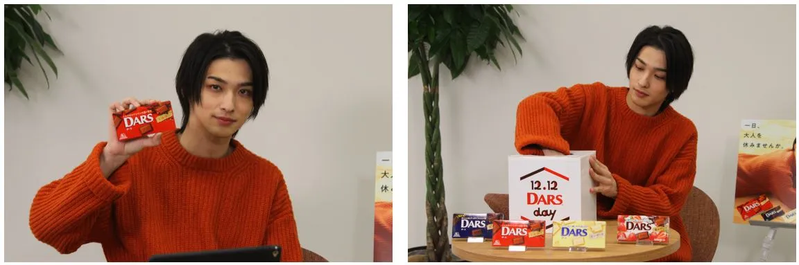 イベントの最後は、来年に向けて「2021年も皆さんに楽しんでいただけるような年にしたいし、役者として皆さんの心を動かす作品を作っていきたいです。」と前向きに語り、「ダースの日スペシャルイベント「EAT WITH EVERYONE」をご覧頂き、ありがとうございました。皆さんも忙しい日常が続くと思いますが、先ほど一緒にダースを食べた食べ方でひと粒大人を休みましょう」と笑顔で締めくくり、ダースのCMと共にエンディングを迎えました。