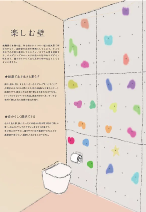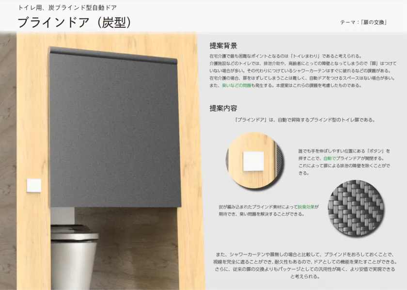 受賞に際して、山本さんは「家族の介護実体験インタビューし、在宅介護で困難なポイントとであるトイレに着目しました。在宅の介護のみならず介護施設でもシャワーブラインドのようなもので仕切っているが、すぐに壊れるといった悩みもわかりました。これら課題を解決するデザインとして考案しました」とコメントしました。