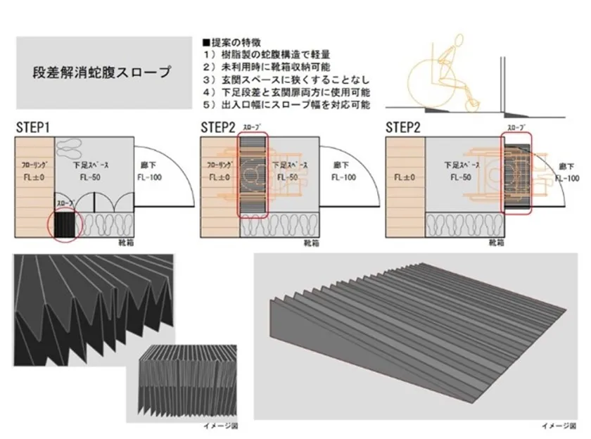 持ち運びが可能で、家の玄関以外にも、駅の重いステンレスのスロープ代替にも活用可能などが汎用性の高さ・低価格で提供できる可能性などが評価されました。