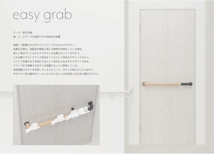 握りかえることなくドアノブをつかめるので利用者目線のデザインである点や、手すりとノブが一体化され家の中の風景が複雑にならない点が評価されました。