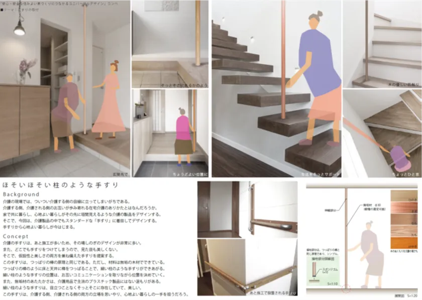 一般的には横に設置する手すりを縦にし、家の空間性を保つことができる点、また、利用者も身長や姿勢を問わず利用ができる点が評価されました。