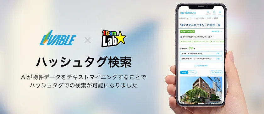 従来、当社のホームページでは、“お客様独自のこだわり”や“物件の細かい特徴”による検索はできませんでしたが、今回、チームラボのテキストマイニング技術(※2)を活用することで、物件毎の特徴を細分化し、ハッシュタグを作成(例:#タワーマンション、#ペット飼育可、#リフォーム済 等)することにより、“独自のこだわり”や“物件の特徴”からお客様の「理想の住まい」をお探しいただくことが可能となります。