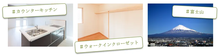 『ハッシュタグ検索』では「#システムキッチン」「#カウンターキッチン」「#アイランドキッチン」等、ハッシュタグを利用してキッチンの種類から理想の物件を探すことが可能になります。他にも「#ウォークインクローゼット」「#全居室収納」といった収納スペースに関するキーワードや「#海」「#富士山」といった環境や眺望に関するキーワードまでタグ付けすることにより、お客様毎に異なるニーズやこだわりに合わせて、効率的に物件をお探しいただくことが可能となります。