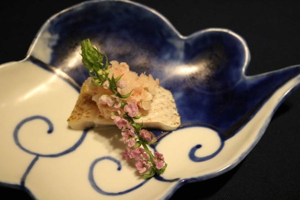 地元おなじみの“のどぐろ”を使って、新しい魅力を引き出した一品です。“のどぐろ”は、芳醇な香ばしさを引き立てるために皮目をしっかりと炙り、付け合わせの生ハムと大根は細かく刻み、柚子果汁と合わせ、さらに生ハムを細かく叩いたものをたっぷりと混ぜ込みました。のどぐろの豊かなコクと、生ハムの熟成したうま味は非常に相性のよいものです。海の幸と山の幸の、新しい出会いを楽しめます。