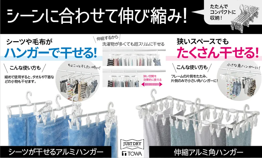 シーンに合わせて伸び縮みすることで、狭いスペースでも たくさん干せる新構造の洗濯ハンガー「JUST DRYシリーズ」 魅力をよりわかりやすく説明した動画を公開!