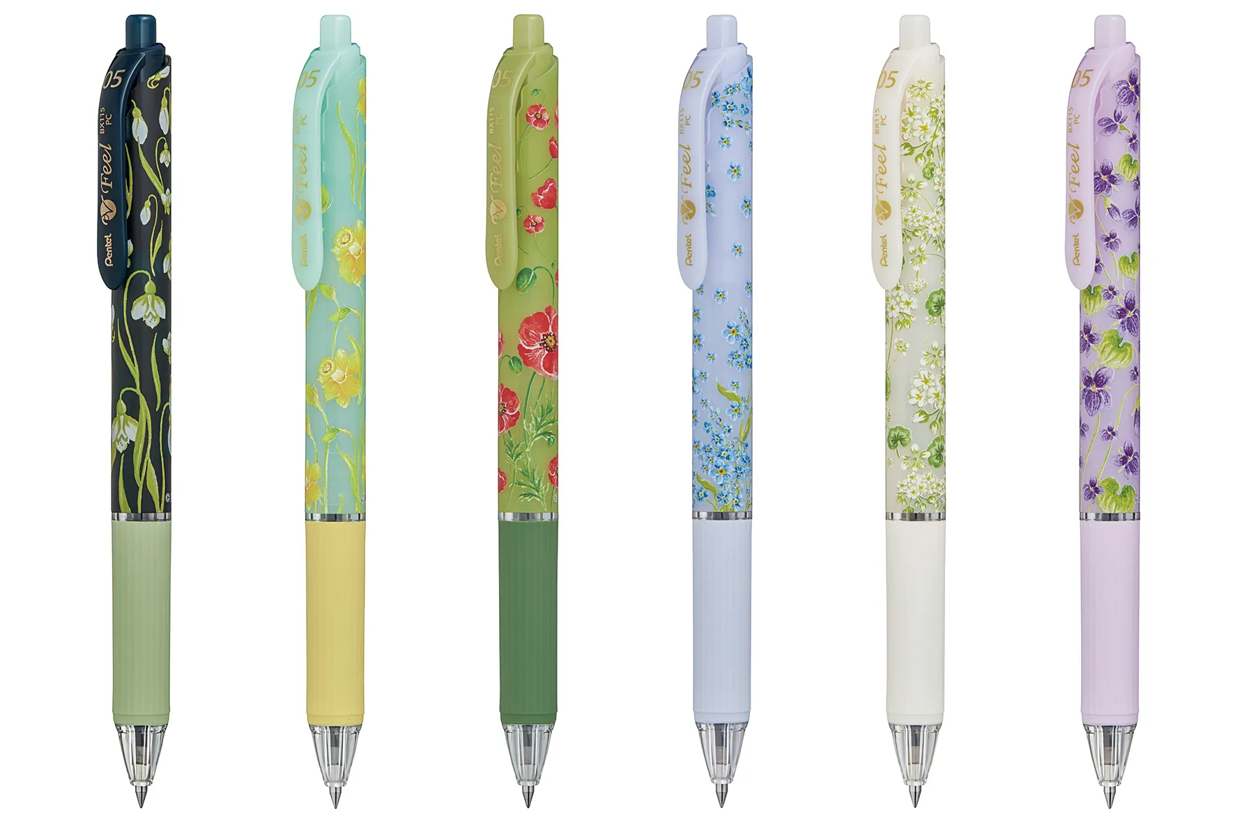 日比谷花壇、 ぺんてるのボールペン「ビクーニャ フィール」 新モデル向けに花柄をデザイン これらの花柄を施した油性ボールペンと修正テープが 12月10日(木)限定発売