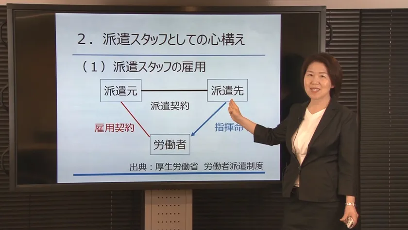 【概要】派遣スタッフが派遣先の社員と協力して働けるよう、自身と派遣会社・派遣先企業との関係性について理解し、社会人としてのマナーの基本を学びます。