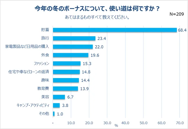続いて、使い道について調査しました。1位になったのは「貯蓄」(68.4%)。2位以降と圧倒的な差をつけてのランクインとなりました。次いで2位「旅行」(23.4%)、3位「家電製品などの日用品の購入」(22.0%)という回答が続きました。