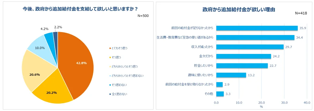 給付金が欲しい理由について聞いたところ、「前回の給付金が足りなかったから」(35.9%)が最も多い回答に。次いで「生活費・教育費などの支給の使い道があるから」(34.4%)、「収入が減ったから」(29.7%)、「金欠だから」(24.2%)という回答が続きました。自分の娯楽のためではなく、生活するにあたって必要なお金に使いたいと考えている人が多いようです。「貯金したいから」(22.7%)という回答にも票が集まり、今後のためにお金を貯めておきたい人も一定数いることが分かりました。