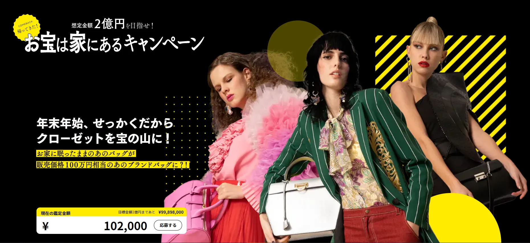 鑑定額の金額が1億円を超えると、ご応募いただいた方の中から抽選で5名様に、店頭価格100万円相当のブランドバッグ他を1点プレゼント。2億円を超えると、さらに5名様にプレゼントします。