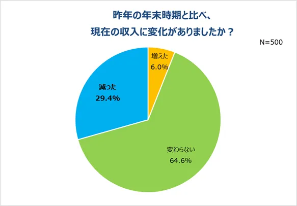 今年は新型コロナウイルスの影響を受け生活が一変しました。コロナの影響を受けたことの一つとして挙げられるのが収入。ボーナスの時期に差し掛かり、収入と支出、ボーナスなどお金について調査しました。まず、昨年の年末時期と比べ収入に変化があったか聞いたところ、最も多かったのは「変わらない」(64.6%)でしたが、「減った」は29.4%と約3人に1人は収入が減っていることが判明。全体の9割以上が昨年の年末時期と比べて収入が増えなかった事実がありました。
