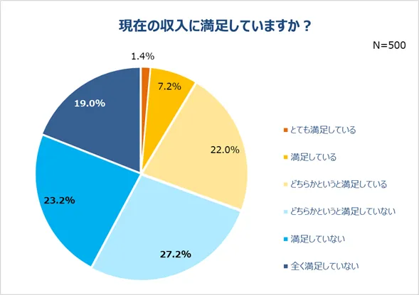 収入の変化について分かりましたが、現在の収入に満足しているか質問しました。すると、「全く満足していない」(19.0%)、「満足していない」(23.2%)、「どちらかというと満足していない」(27.2%)を合わせて、69.6%という結果に。約7割弱の人が現状の収入に満足していないことが判明しました。どちらかというと満足している人は22.0%で、「とても満足している」「満足している」と、満足していると断言できる人は8.6%と、現状の収入に対する満足度は全体的に低いようです。