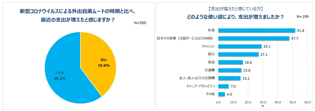 2.約4割が、支出増。使い道1位「外食」2位「自宅での食事」